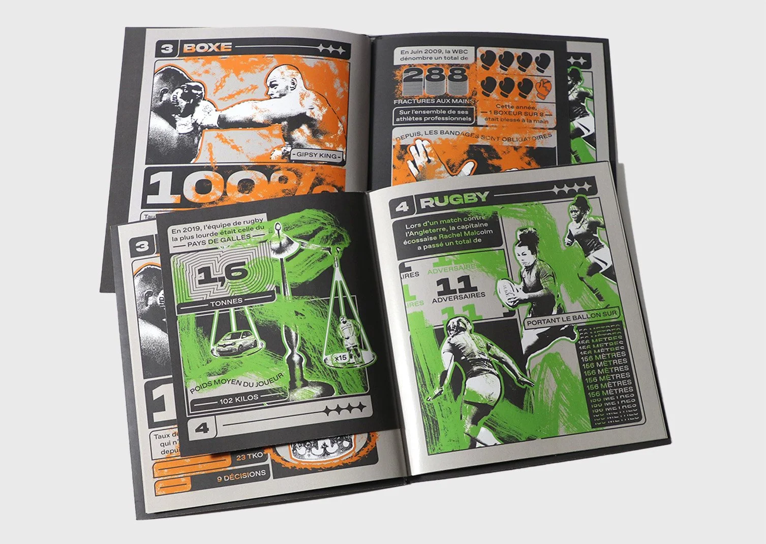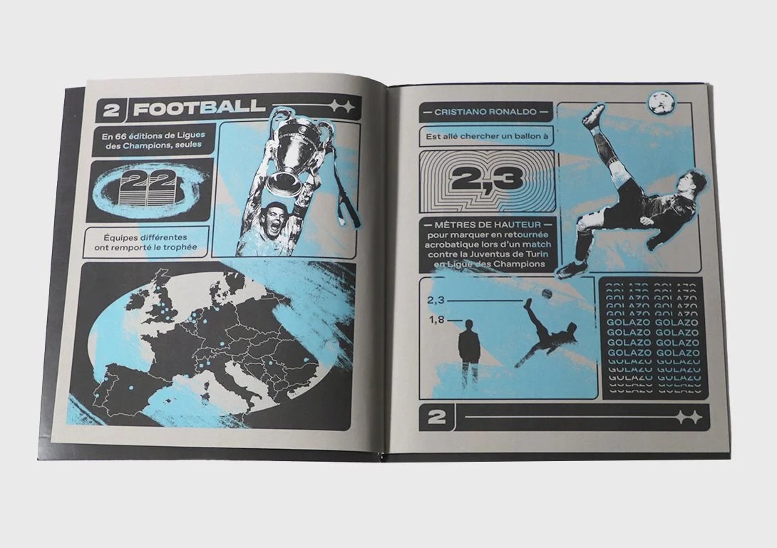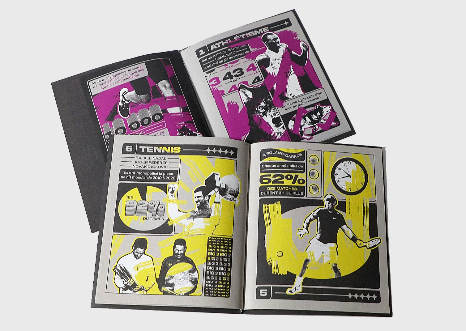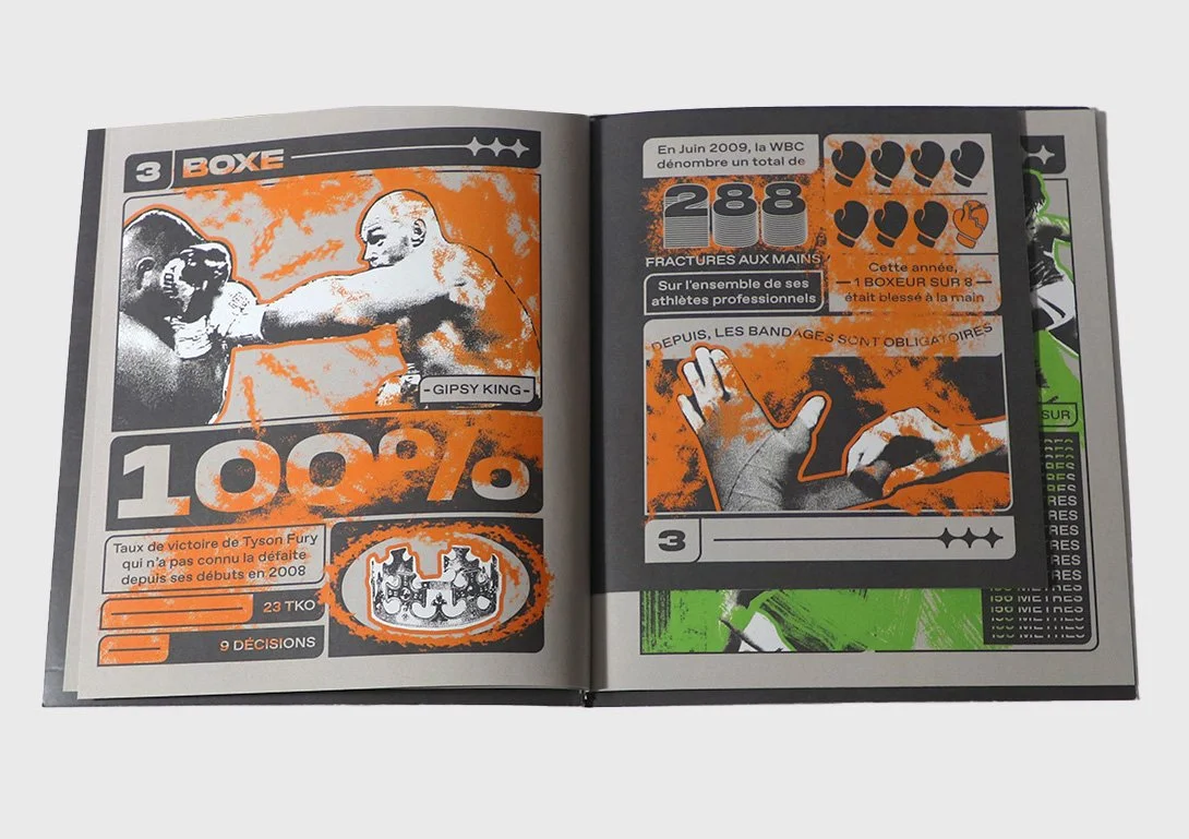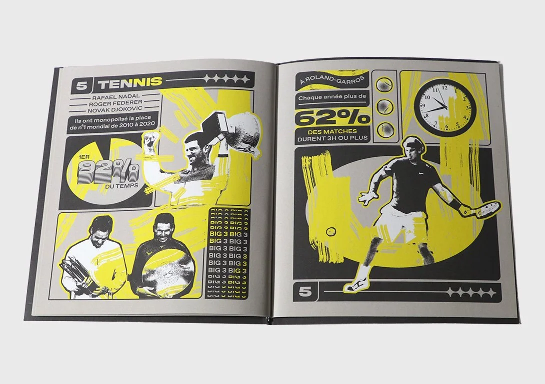 Micro-édition de statistiques sur le sport à haut niveau. Travail réalisé avec le graphiste Simon Legouard. Nous avons créer une esthétique adaptée au sport, composant les informations avec des visuels. Chaque sport a sa couleur et son brush, symbolisant le dynamisme de la discipline. Nous avons décliné toutes les pages en motion design, ce qui a influencé nos choix graphiques.